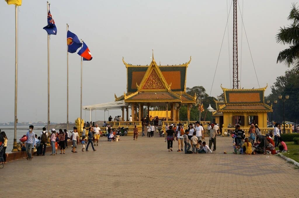 Il est très agréable de se promener en soirée, à la tombée du soleil, car les températures en journée sont chaudes et l’atmosphère moite et humide. Un des endroits agréables pour se promener en soirée est le Quai Sisowath : regarder d’un côté le soleil se coucher sur le Palais Royal, et de l’autre, les bateaux passer sur le Tonlé et le Mékong.