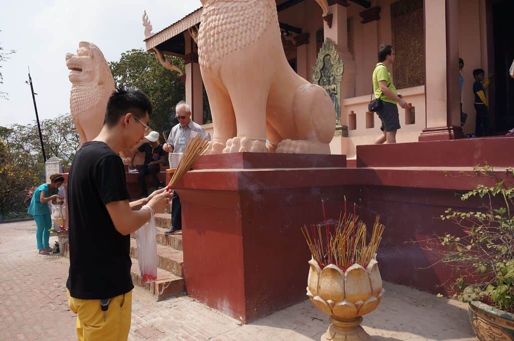 Perché sur la seule colline de la ville, ce temple-musée est fréquenté par les khmers, venus prier pour obtenir de la chance. Avant un examen ou en entretien d’affaires important, c’est l’étape à ne pas manquer pour s’assurer de sa réussite. Et si les prières sont exaucées, le Cambodgien revient pour apporter l’offrande promise aux pieds des autels : bananes, fleurs …