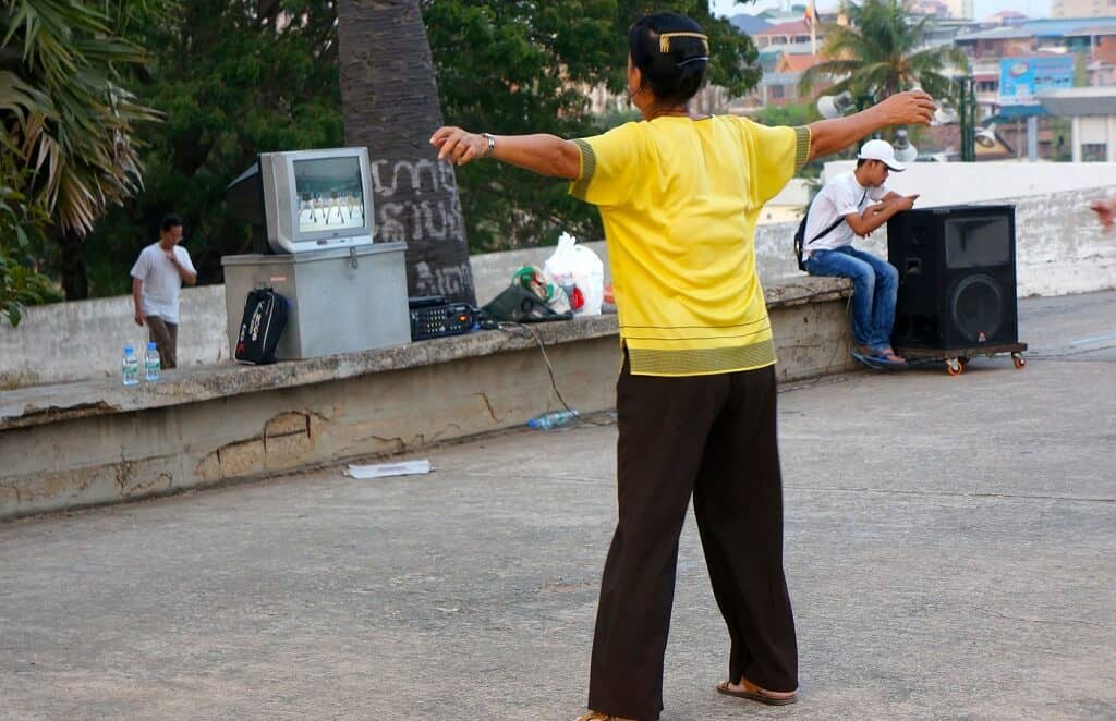 On y observe aussi des cambodgiens se retrouver entre amis, faire un jeu qui est une sorte de badminton avec les pieds (le dacau) et des séances d’aérobic en plein air (en face du restaurant Blue Pumpkin et au stade olympique).